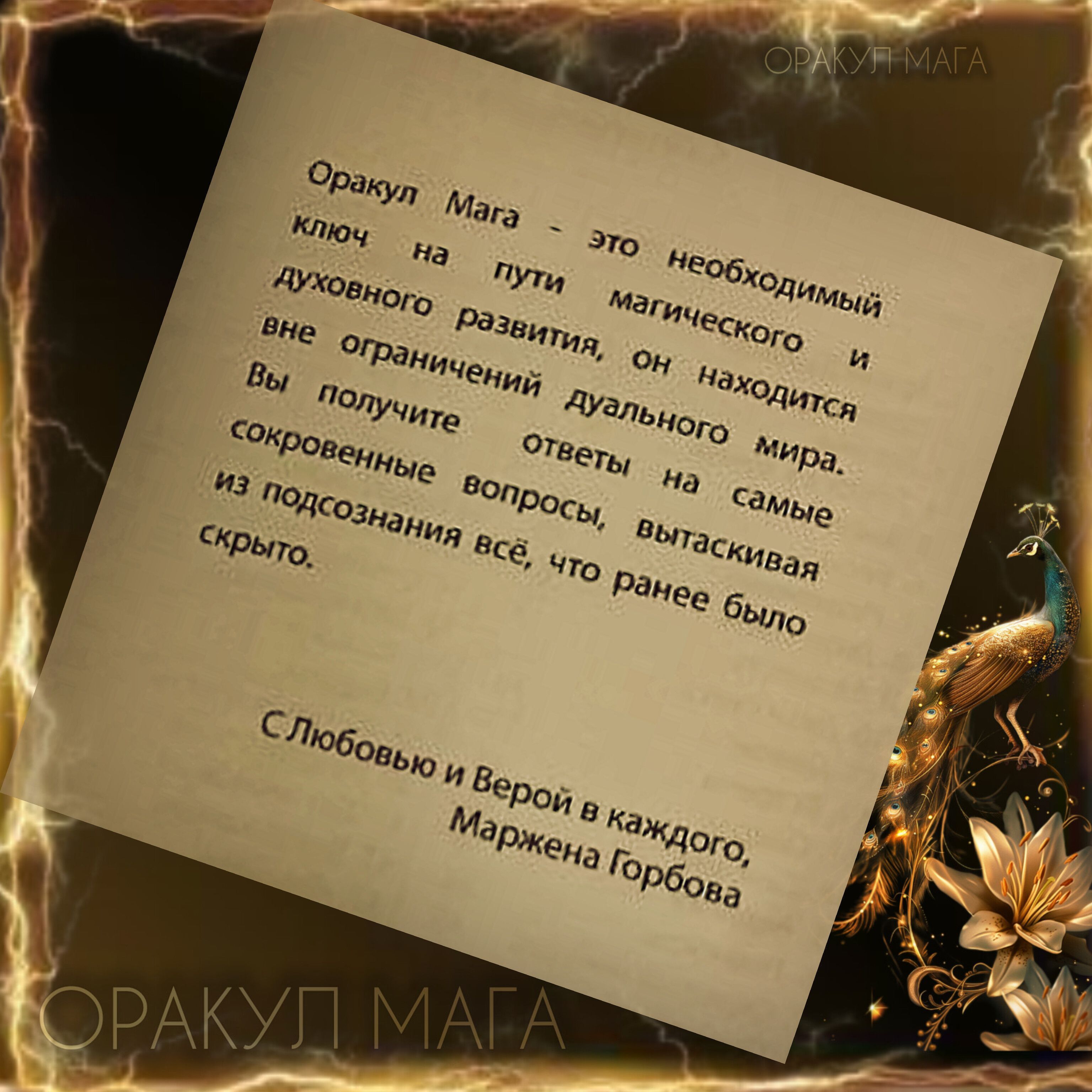 Оракул мага - это лучший помощник на пути магического и духовного развития. Оракул поможет понять абсолютно все ситуации, которые происходят с вами, это поможет сделать переоценку событий и изменить жизнь в самую лучшую сторону. Эта колода незаменима и для магических диагностик. Она подробно расскажет о воздействиях из иных миров, а также о том, как выйти из самых сложных ситуаций. С помощью Оракула Мага вы можете общаться со своими Высшими Силами : Богами, хранителями, помощниками. Этот Оракул снимает большинство магических непроглядов, что позволяет узнавать самую тайную информацию. Оракул уже зарекомендовал себя, как прекрасный магический инструмент в руках сотен практиков и эзотериков. Мы уверены, что именно эта колода будет вашим незаменимым другом и помощником