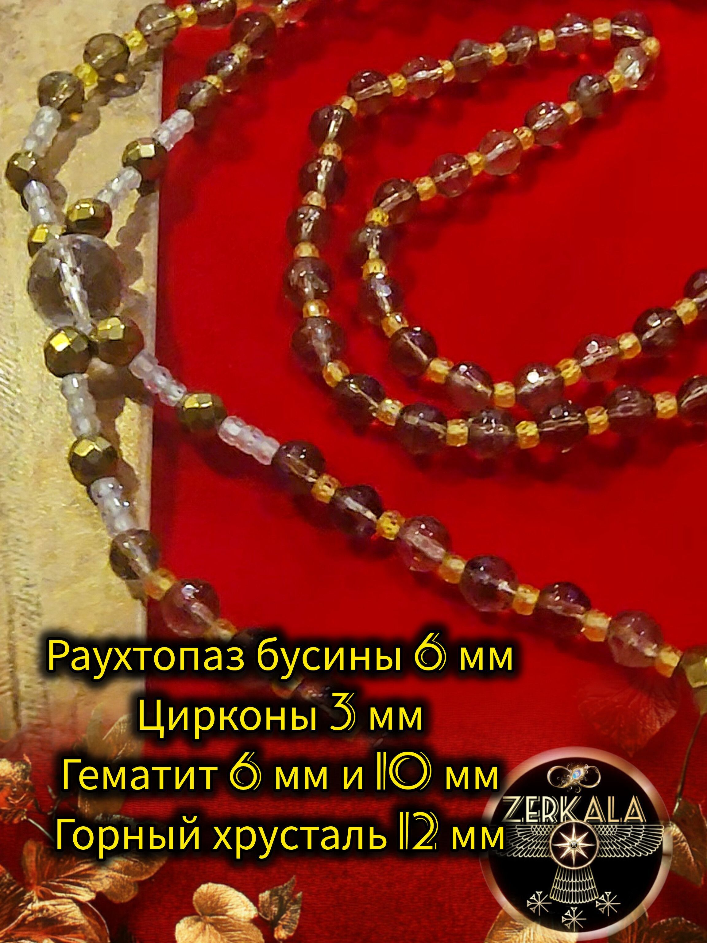 Бусы из раухтопаза, цирконов, гематита и горного хрусталя.